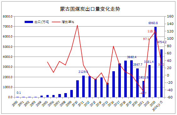 据蒙古国海关机构(Mongolian Customs Service)发布的统计数据显示,2024年1-7月份,蒙古国煤炭出口量累计为4754.18万吨,比上年同期增加1212.2万吨,同比增长34.2%。