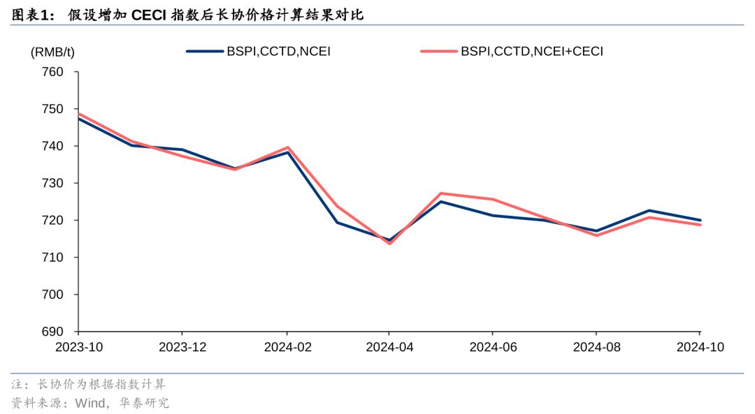 价格机制整体仍延续2024年中长协合同要求,港口价格按“基准价+浮动价”签订和执行,不超过570-770元/吨的合理价格区间,浮动价的计算部分在去年全国煤炭交易中心综合价格指数(NCEI)、环渤海动力煤综合价格指数(BSPI)、秦皇岛动力煤综合交易价格指数(CCTD)三个指数基础上增加中国电煤采购价格指数(CECI)。对比增加CECI后计算所得长协价与仅用原有三个指数计算所得长协价在过去12个月的表现,二者平均差值仅有0.6元/吨,增加CECI后对浮动价计算影响或有限。