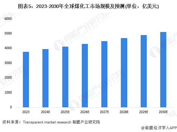 在地缘政治因素频发导致石油与天然气供应短缺的情况下,全球煤化工产业逐步迎来了下游需求高速扩张的时期,在全球煤化工产业技术发展已有深厚积累情况下,全球煤化工产业未来将保持较为平稳的发展态势。结合全球煤炭产业的市场规模及煤化工在煤炭产业中的占比情况,初步统计2024年全球煤化工市场规模接近4000亿美元,到2030年有望超过5000亿美元。