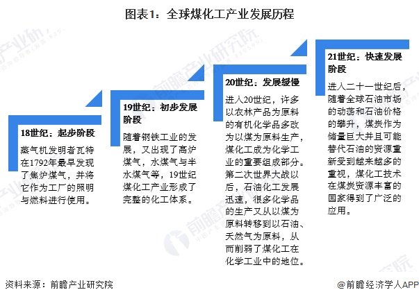 全球煤化工开始于18世纪,蒸气机发明者瓦特在1792年最早发现了焦炉煤气,并将它作为工厂的照明与燃料进行使用。此后随着钢铁工业的发展,又出现了高炉煤气,水煤气与半水煤气等,19世纪煤化工产业形成了完整的化工体系。