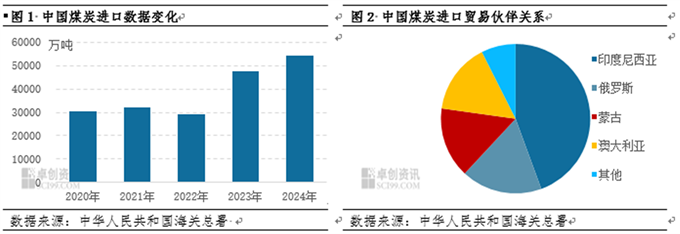 2024年,在进口煤价格优势支撑下,中国煤炭进口总量创历史新高,据中华人民共和国海关总署数据显示,2024年中国累计进口煤炭总量为5.43亿吨,同比增长14.4%,创历史新高。从进口贸易伙伴关系来看,中国煤炭进口贸易伙伴关系一直是比较稳定的,中国煤炭进口贸易伙伴主要为印度尼西亚、俄罗斯、澳大利亚、蒙古4个国家,中国自以上4个国家进口煤炭数量在中国煤炭进口总量中占比大约在90%以上,处于绝对优势地位;而中国自美国进口煤炭数量在中国煤炭进口总量中占比约在2%左右,占比较小,加征49%关税后,将会使自美进口煤炭成本大幅提升,美国煤炭进口价格优势消失,但当前国内煤炭供需格局持续宽松,国内煤价重心整体下移,美国煤炭进口量将被国内煤源或澳大利亚、蒙古等其他有优势的进口煤源替代。因此加征关税对国内煤炭进口影响有限。