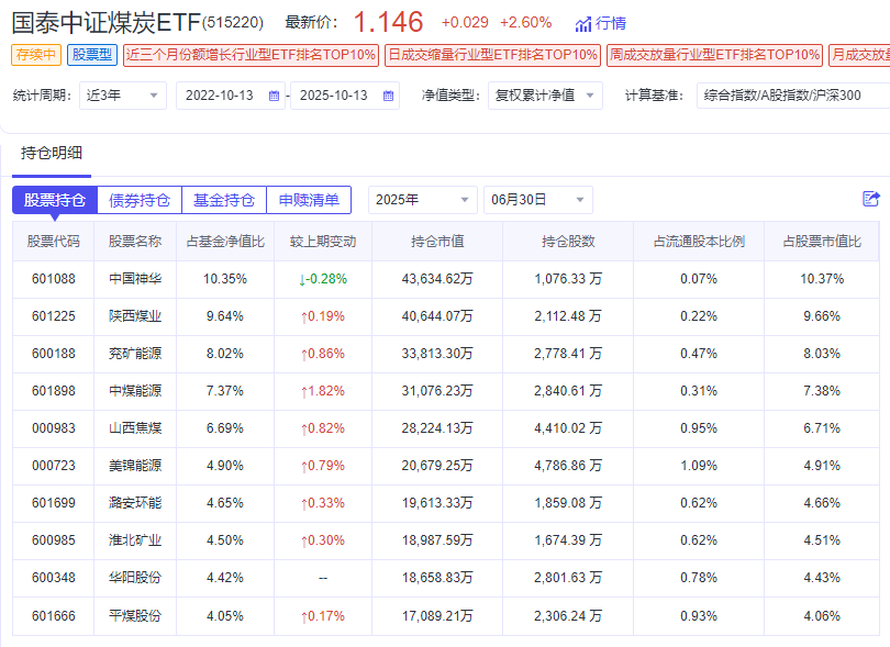 ETF 十大重仓个股中,陕西煤业(21.540, 0.21, 0.98%)、潞安环能(15.440, 0.04, 0.26%)和晋控煤业(15.280, -0.21, -1.36%)表现尤为突出,当日涨幅分别为 3.75%、 5.7%和 3.82%。此外,兖矿能源(14.260, -0.10, -0.70%)、中煤能源(12.360, 0.11, 0.90%)等个股涨幅也超过 2%。