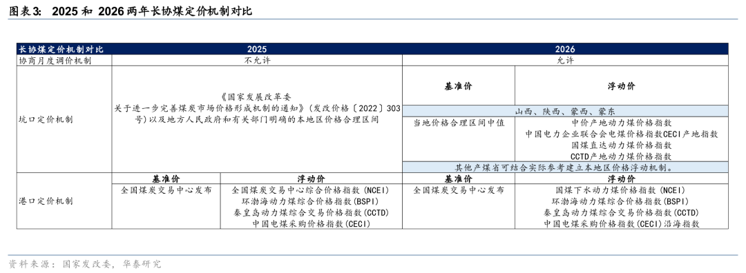 坑口定价合同月度浮动机制也引入4大指数,和港口长协定价机制对齐。2025版坑口定价按照2022文件的本地区价格合理区间签订和履约,2026版规定山西、陕西、蒙西、蒙东煤炭出矿环节中长期交易 “浮动价”采用中价产地动力煤价格指数、中国电力企业联合会电煤价格指数 CECI 产地指数、国煤直达动力煤价格指数、CCTD 产地动力煤价格指数综合确定(图3);具体每个月的数值由全国煤炭交易中心按月测算发布。其他产煤省区可结合实际参考建立本地区价格浮动机制。其中“浮动价”机制对标了2025版港口长协公式,将全国煤炭交易中心综合价格指数 (NCEI) 和环渤海动力煤综合价格指数(BSPI) 分别替换为了更能代表坑口价格趋势的中价产地动力煤价格指数和国煤直达动力煤价格指数。
