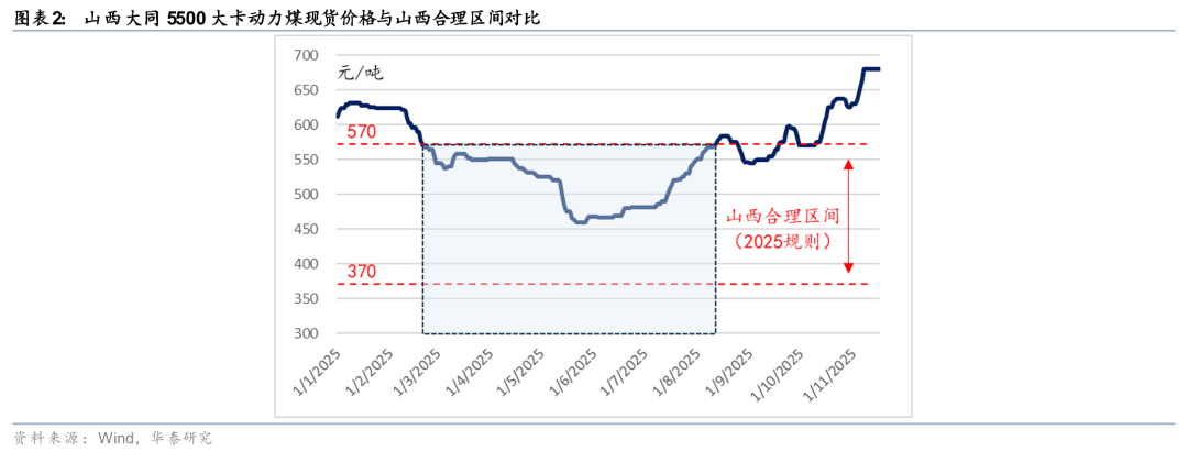 我们认为供需双方协商一致的月度调价机制将会形成更贴合市场供需形势的履约价格,有利于稳定长协履约率。《关于做好2025年电煤中长期合同签订履约工作的通知》(发改办运行〔2024〕941号)(以下简称“2025版”)将坑口长协定价机制限定在《国家发展改革委关于进一步完善煤炭市场价格形成机制的通知》(发改价格〔2022〕303号) (以下简称“2022文件”)“本地区价格合理区间”(图1),以山西为例,如去年签约时按照合理区间上限570元/吨定价,今年3-8月现货低于这一水平的阶段(图2),电厂履约意愿自然会降低,而其他现货价格高的月份煤炭企业履约意愿也会受影响。2026版规定“价格月度调整机制可由供需企业结合市场情况自主协商确定,但必须具有明确的价格及调整机制;也可参照下述 “基准价+浮动价”机制确定出矿环节价格”,我们认为通过引入市场化因子使履约价格更贴合市场供需形势、有利于稳定长协履约率。