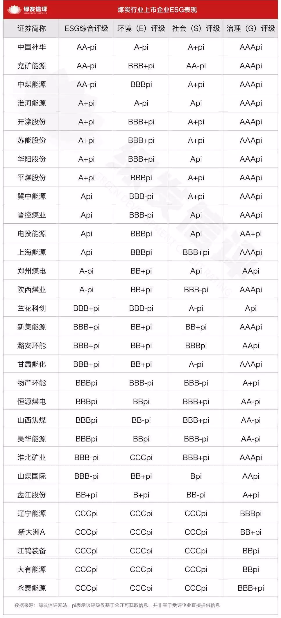 绿发信评主动评级结果显示,煤炭行业ESG发展呈现梯度特征,同时缺少AApi及以上的高评级。30家煤炭企业中,评级梯度跨度大,中国神华、兖矿能源、中煤能源三家头部企业凭借全面的战略布局与扎实的实践成效,获AA-pi评级,引领了行业转型方向;淮河能源、开滦股份、苏能股份、华阳股份、平煤股份获A+pi评级;冀中能源、晋控煤业、电投能源、上海能源获Api评级;郑州煤电、陕西煤业获A-pi评级;兰花科创、新集能源、潞安环能、甘肃能化为BBB+pi评级;物产环能、恒源煤电、山西焦煤、昊华能源获BBBpi评级;淮北矿业、山煤国际为BBB-pi评级;盘江股份获BB+pi评级;辽宁能源、新大洲A、江钨装备、大有能源、永泰能源获CCCpi评级。