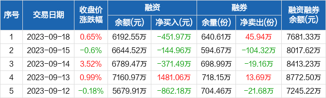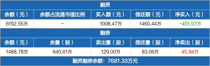 融资方面,当日融资买入1008.47万元,融资偿还1460.44万元,融资净偿还451.97万元,连续3日净偿还累计968.42万元。融券方面,融券卖出129万份,融券偿还83.06万份,融券余量640.61万份,融券余额1488.78万元。融资融券余额合计7681.33万元。