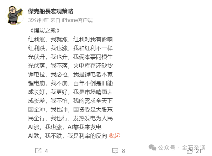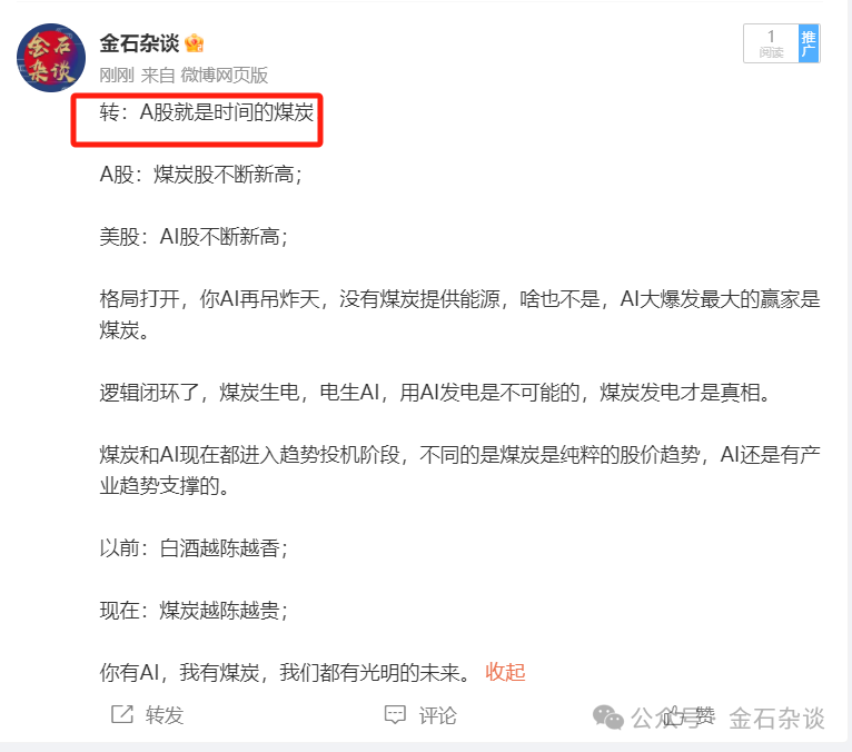 甚至,段子手们说,A股就是时间的煤炭。格局打开,你AI再吊炸天,没有煤炭提供能源,啥也不是,AI大爆发最大的赢家是煤炭。逻辑闭环了,煤炭生电,电生AI,用AI发电是不可能的,煤炭发电才是真相。