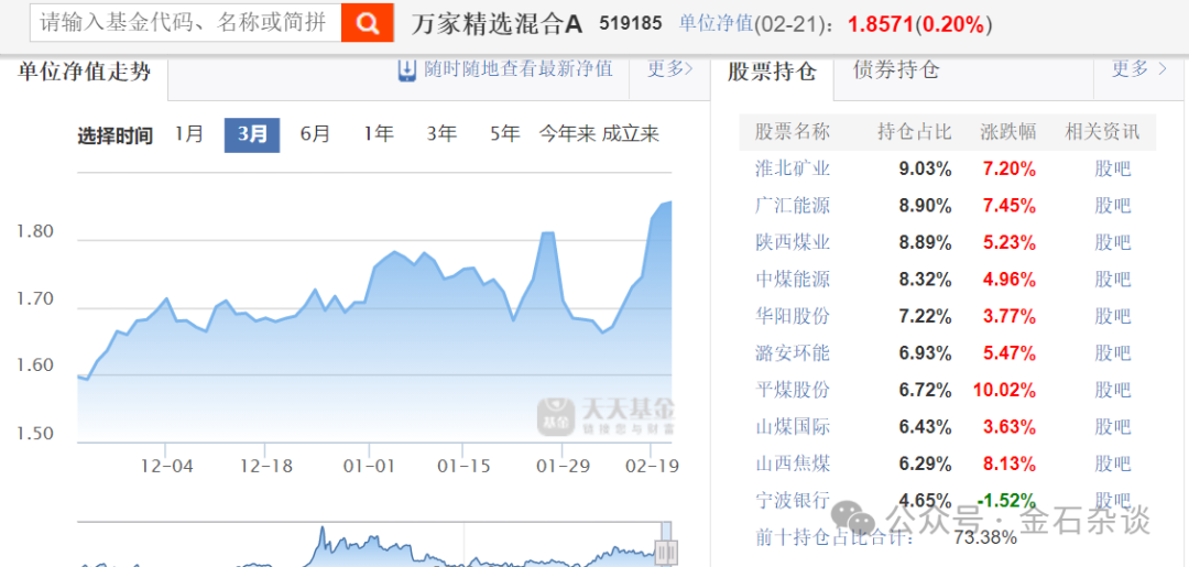 真正涨幅第一的则是万家精选混合,满仓的煤炭、能源,辅之部分银行。