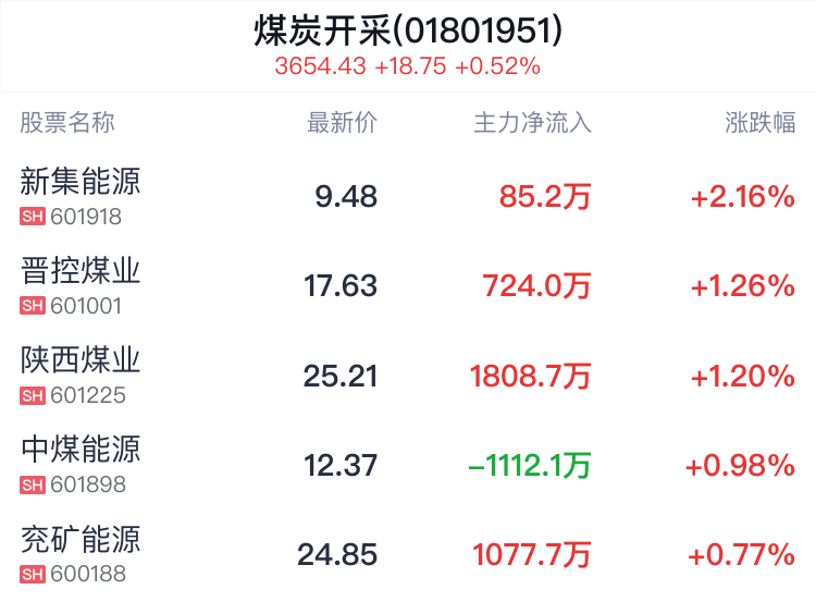 从个股上来看,该行业的成分股中,新集能源(9.540, 0.26, 2.80%)涨2.26%,晋控煤业(17.570, 0.16, 0.92%)、陕西煤业(25.020, 0.11, 0.44%)、中煤能源(12.300, 0.05, 0.41%)涨幅居前。