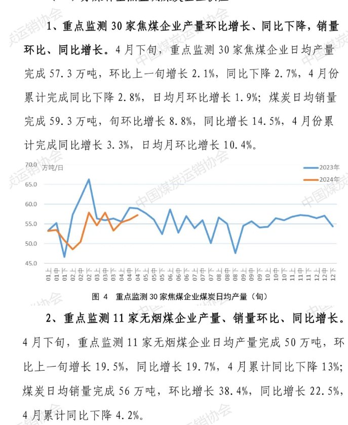 据中国煤炭运销协会数据,4月下旬,重点监测30家焦煤(1664, -1.50, -0.09%)企业日均产量完成57.3万吨,环比上一句增长2.1%,同比下降2.7%,4月份累计完成同比下降2.8%,日均月环比增长1.9%;煤炭日均销量完成59.3万吨,旬环比增长8.8%,同比增长14.5%,4月份累计完成同比增长 3.3%,日均月环比增长10.4%。