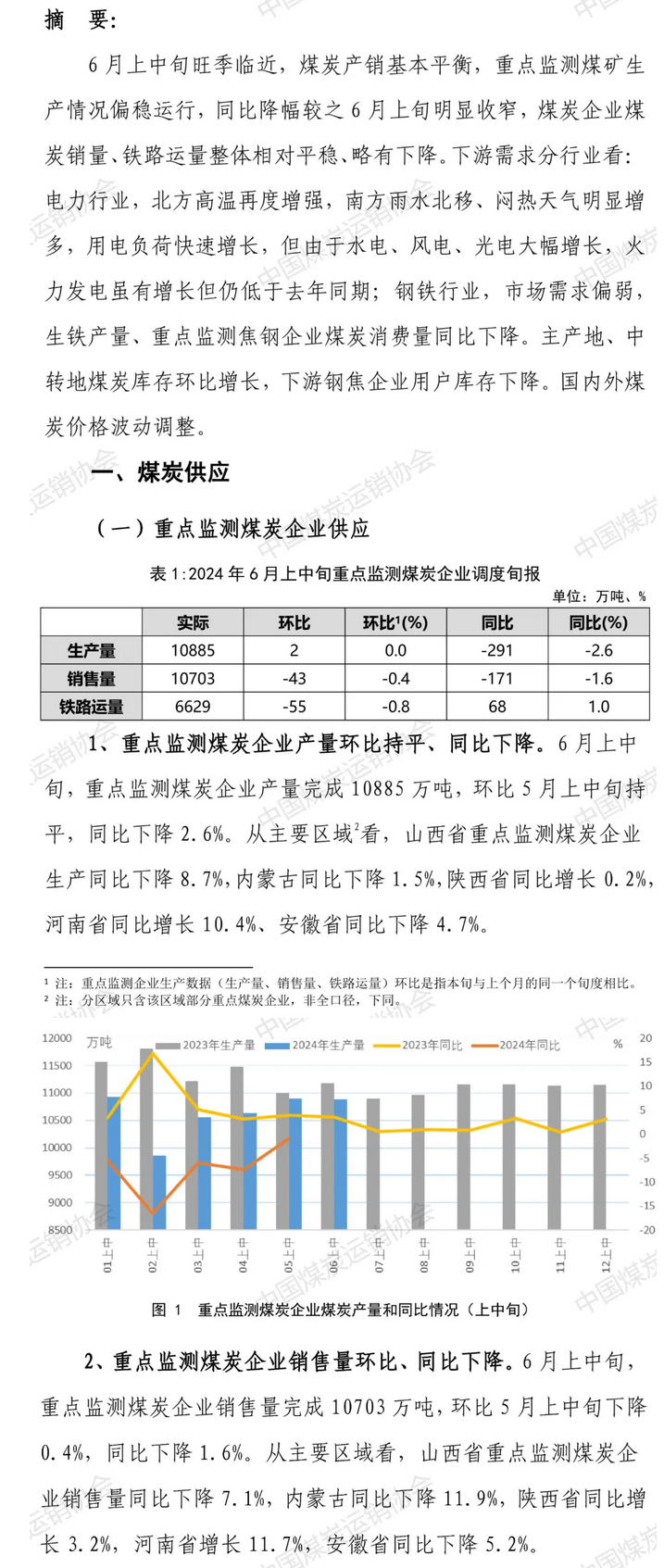 据中国煤炭运销协会消息,6月上中旬,重点监测煤炭企业产量完成10885万吨,环比5月上中旬持平,同比下降2.6%。